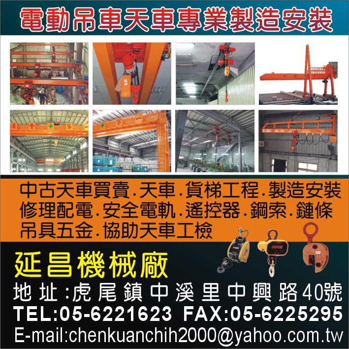 營業項目:各國電動吊車、天車、中古天車買賣、貨梯工程、天車製造安裝、天車維修、天車修理配電、天車安全電軌、天車遙控器、天車鋼索、天車鏈條、吊具五金、協助天車工檢、天車零件、超短型天車、電動吊車、吊車、電軌...等。