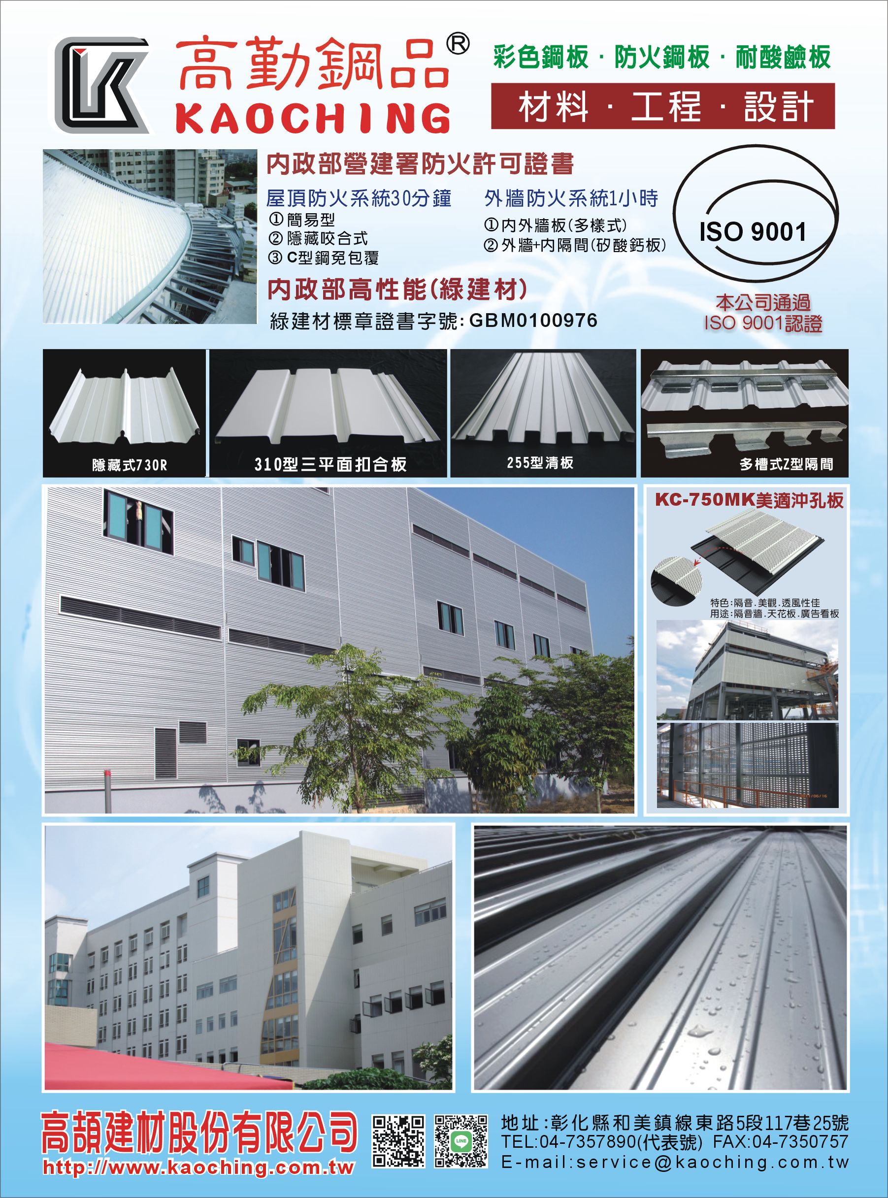 經營項目:彩色鋼板、防火鋼板、耐酸鹼板、防火時效鋼板、防火屋頂板、防火壁板、外牆防火、750型高角浪板、三山鋼板、曲彎造形板、高性能沖孔吸音板、免包覆防火屋頂板、屋面防火鋼板、牆面防火鋼板、全樹脂板...等。