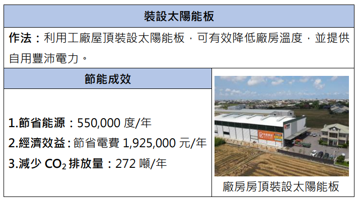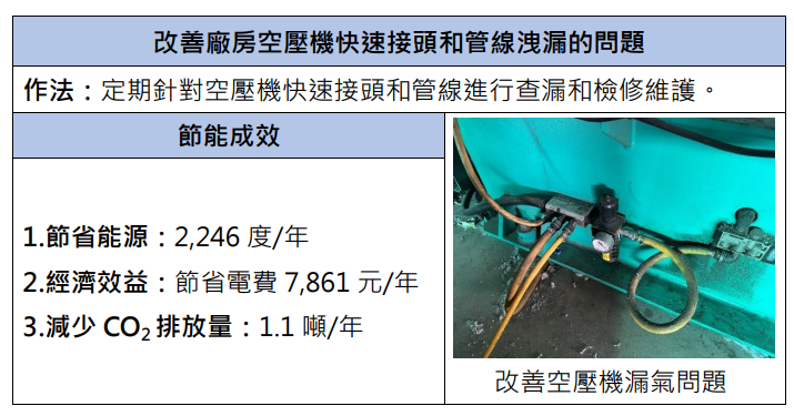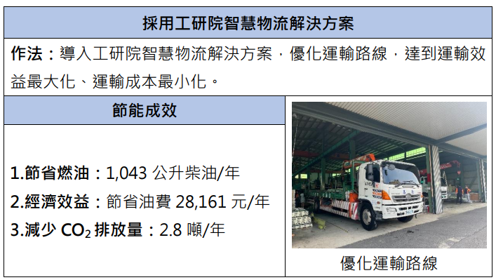 第一是改善廠房空壓機快速接頭和管線洩漏的問題。工研院訪視診斷團隊發現,公司的空壓機快速接頭和管線出現明顯的洩漏,透過定期查漏和檢修維護,預計將可節省約10%的損失;第二是於廠房屋頂裝設太陽能板。公司廠房佔地1,100坪,坐擁廣大的腹地,若能裝設太陽能板來發電,不僅可以替廠房起到隔熱降溫的效果,也能夠提供豐沛的電力予工廠直接自用;第三則是物流路線優化。工廠擁有多部柴油貨車提供配送產品給客戶之服務,但是由於缺乏良好的物流路線規劃,導致公司碳排放量居高不下,車用燃油所產生之碳排占比更達到整體碳排放的一半。一旦導入工研院設計的智慧物流解決方案,將可減少至少5%的油料成本。