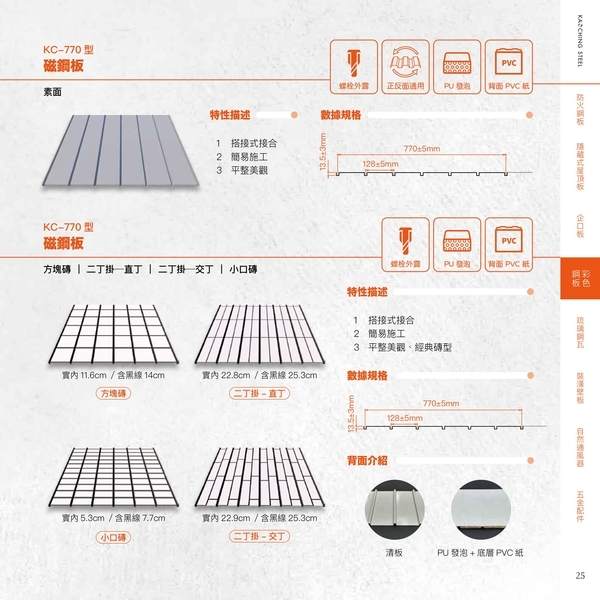 彩色鋼板-磁鋼板(方塊磚/二丁掛-直丁/二丁掛-交丁/小口磚),型號:KC-770型, - 高勤鋼品