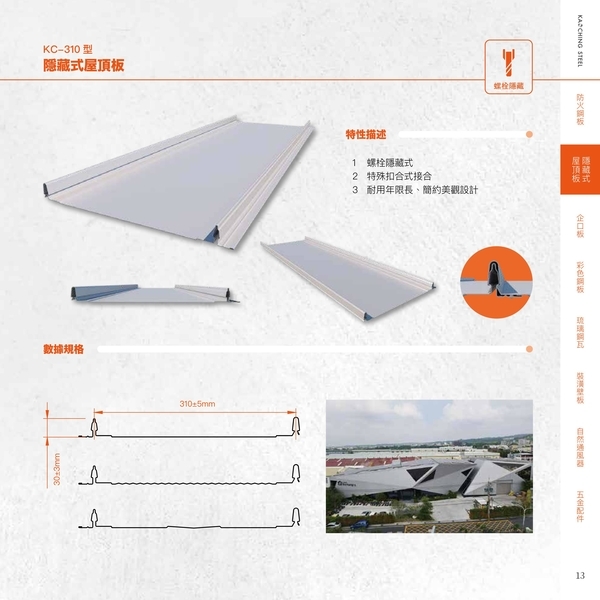 隱藏式屋頂板產品 ,型號:KC-310型 - 高勤鋼品
