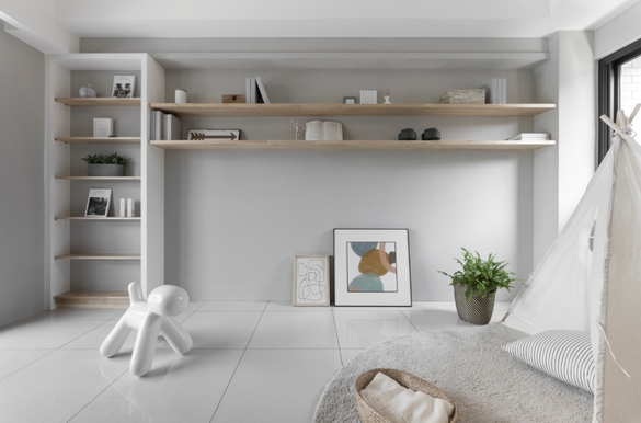 而在收納規劃上可以選擇整面展示收納櫃或儲物櫃,讓東西不會散落一地。