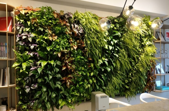 充滿各種植物的水耕綠牆,在這樣的環境條件下,合適的植栽大部分是蔓綠絨品系、波士頓蕨品系、千年木品系、粗勒草品系等,能輕鬆為空間呈現出蓊鬱蒼翠的綠意形象,而說到後續維護的方式,其實沒有想像中困難,只要每個月把枯葉子拔一拔,有爛掉耗損的植物換新,接著噴抗菌抗介殼蟲藥,如此就能讓植物能好好生長。