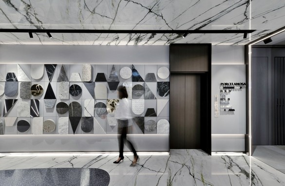 台中七期的PORCELANOSA旗艦館接待大廳,天地壁合成一氣(Calacatta Green綠卡拉)