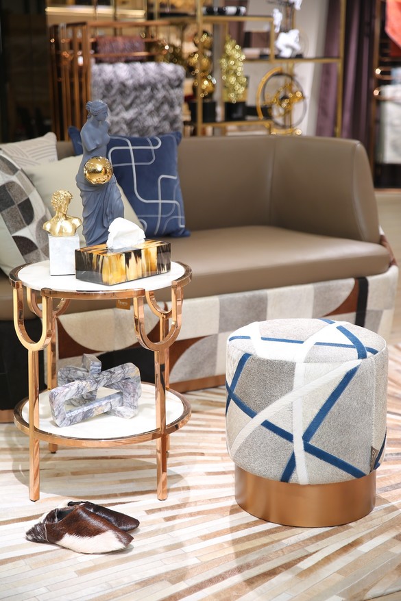 受到不少顧客所青睞的熱銷產品『巴西天然牛皮地毯』。是由師傅一塊一塊親手拼貼、縫製,並不添加任何化學染色劑、抗污劑,並獨家開模加厚PU皮革防霉防潮防滑,希望除了美麗,還必須耐久、安全。
