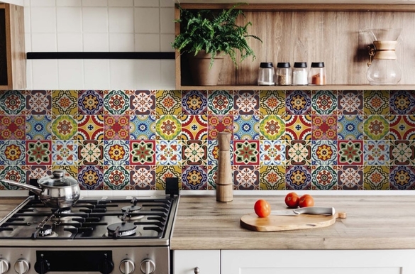 流理檯壁面是最常被用來做花磚設計的區域,但由於烹飪時食物可能濺灑至牆面,材質可選用抗汙力佳的釉面磚,或是耐磨的玻化磚。此區域採用花磚設計的另一重點是保持視覺上的整潔度,顏色、圖樣簡單的花磚是理想的選擇。若喜歡色彩繽紛、圖樣特別的花磚,建議可將貼面範圍縮小,減少視覺上的凌亂感。另外,廚房單側壁面也是另一個可以使用花磚設計的區域,其大面積特性,可採用具延展性、連續性的圖形設計。