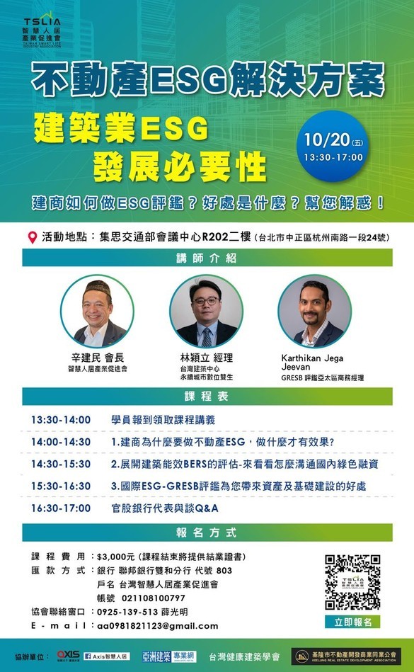 為了讓不動產、建築業了解落實ESG的重要性,以及對外來趨勢的掌握,特別邀請到智慧人居產業促進會辛建民會長、台灣建築中心永續城市數位雙生林穎立經理、Karthikan Jega Jeevan GRESB評鑑亞太區商務經理,從不動產ESG的發展必要性、建築能效BERS評估,以及國內綠色融資等等,透過最專業的觀點、豐富的實務經驗告訴大家,建築不動產「淨零排放」到底該怎麼做,好處有哪些?以及如何解決現有難題。本次除了座談分享外,也有官股銀行代表Q&A,一起了解不動產、金融界如何在ESG的趨勢下,也能在金融政策、GRESB評鑑中,以各自用最有效率的合作方式,追求永續環境的同時,達到節能減碳的目標。