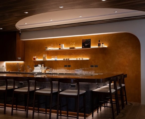 另外,Caju在入口與主空間之間設置的「緩衝區」,透過帶有迴廊感的走道作為身心轉換的引導點,邀請顧客在入座前先調整呼吸與情緒,吧台後方的茶酒選品牆面,不僅僅是功能陳列,更像是一面記憶的拼貼牆,每一罐茶與每一瓶酒都有被「訴說」的可能。這種結合飲食與情感記憶的設計手法,呼應當代人對「生活儀式」的熱切渴望,也使Caju成為一處既能獨酌也能共飲的複合空間。