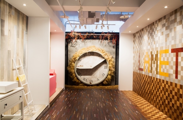 樂邁總部位於台中市,近期與陳銘達設計師合作,在台北設計建材中心設立旗艦店,設計120坪左右的體驗空間,運用人字貼等多種拼貼方式,呈現石晶地板的組合特性。設計師以客廳展示空間為中心,規劃符合商業行為的迴遊動線,消費者可回到中心點繼續選購,或是任意選擇到不同的展示空間。