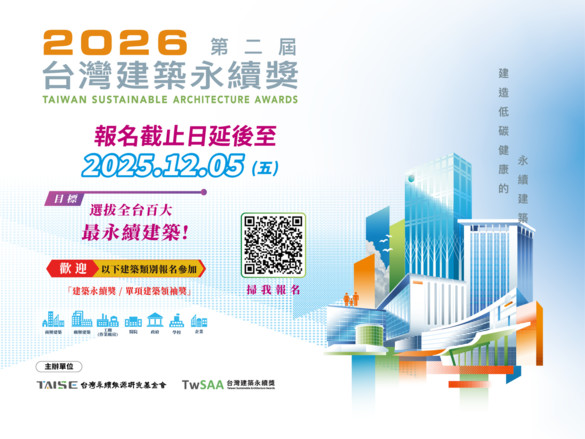 台灣永續能源研究基金會(TAISE)宣布,「2026第二屆台灣建築永續獎」自即日起開放徵件,報名至2025年12月5日止。繼首屆成功舉辦並吸引眾多業界矚目後,本屆獎項呈現兩大亮點,不僅延續專業、公正的評選機制,更首度鼓勵屋齡20年以上的建築參賽,表彰在整建維護過程中展現節能減碳、創新再生的優秀案例,開創永續建築的新典範。