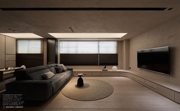 客廳藉由特殊塗料鋪展牆面及天花,讓粗獷肌理在光膜燈罩的柔和漫射下顯得溫潤,深調框景搭配局部木皮立面,使公共區展現一種「緩慢沉澱」節奏,彷彿踏入便能卸下一日疲憊。公領域以「沉穩簡潔」作為美學核心,融合現代線條與日式侘寂氣質自然交融,打造一個能靜心、能呼吸、能對話的開闊場景。