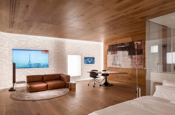 牆體運用杜邦的Tyvek ®「泰維克」,融合了窗戶、螢幕、燈箱與顯示器,形成了三面多媒體透視牆面,並運用LED光源平均分布在透視牆面上,半透明的透光牆紙,弱化了厚重的牆體所帶來的邊界感,取而代之的是柔和的燈光,以及可調式的調光玻璃與螢幕,隨時可任由心情變換調整頻道,或是將調光玻璃關閉,在牆體上穿插著虛實整合的景象。