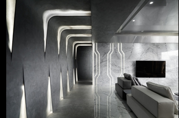 對空間來說,利用光線的明暗角度變化也是設計的原則之一。另外透過不同尺寸或高低差排列,打造奇幻且高級的未來感。或者,加高的地坪內嵌燈具於加高的地板下,就能營造出猶如懸浮在空中的地板一樣,帶來令人驚喜滿點的科幻衝擊!