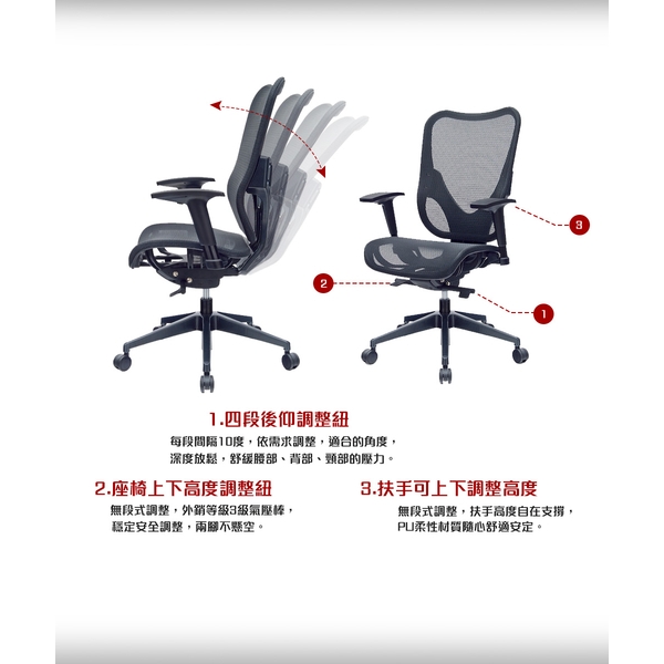 • 高背完整包覆腰背,自載重四段後躺固定底盤• 進口超透氣網布,久坐不悶熱
