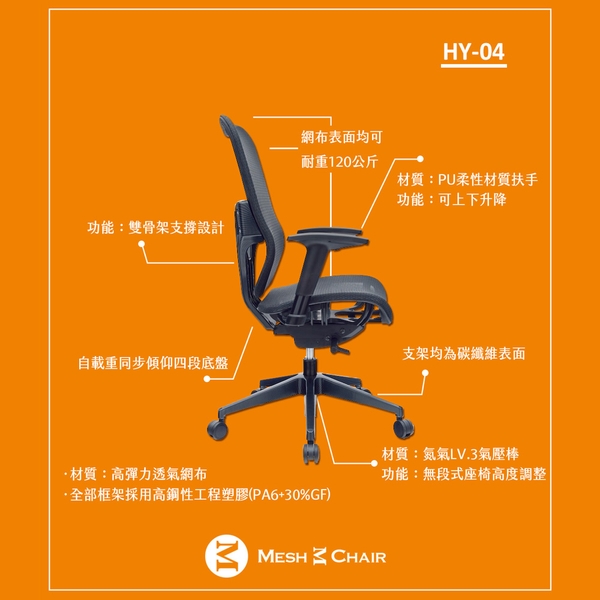 人體工學設計、多功能可調整、全網透氣、五年保固