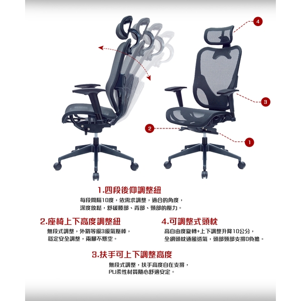 椅座扶手調整高度: 上下調整10 cm 每1cm 1段