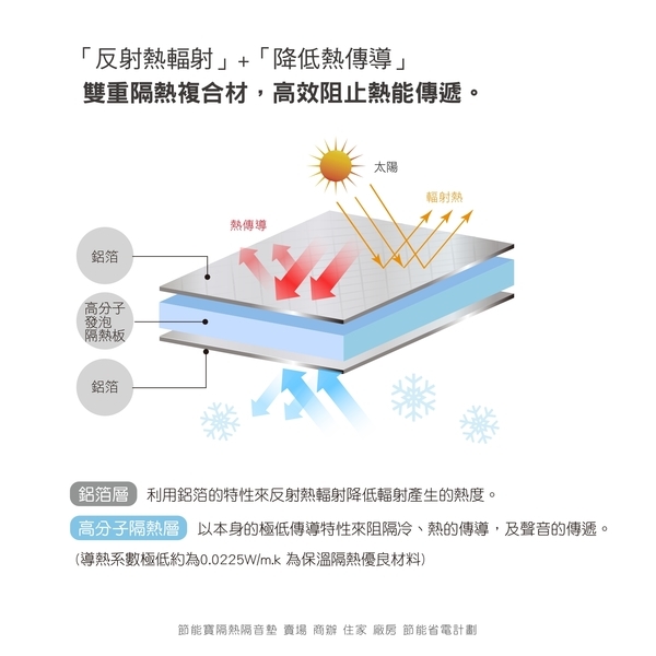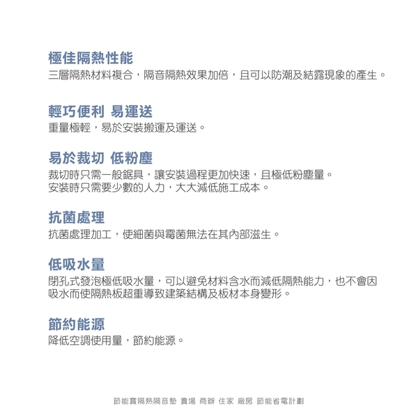 節能寶隔音隔熱墊源自於新時代生活空間、作業環境節能隔音隔熱的需求,無論生活居家、工作環境、商業空間、 工業廠房,溫度與噪音的控制都是高品質、高效能與環境 永續的基本需求。 追求節能減噪宜居的生活空間,是普 世價值、是社會責任、也是我們持續努力的目標。