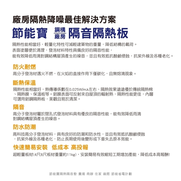 節能寶隔音隔熱墊源自於新時代生活空間、作業環境節能隔音隔熱的需求,無論生活居家、工作環境、商業空間、 工業廠房,溫度與噪音的控制都是高品質、高效能與環境 永續的基本需求。 追求節能減噪宜居的生活空間,是普 世價值、是社會責任、也是我們持續努力的目標。