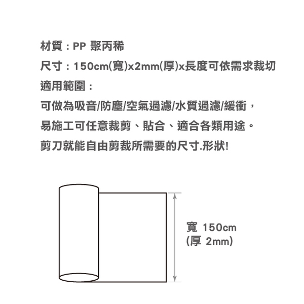 可做為吸音/防塵/空氣過濾/水質過濾/緩衝,易施工可任意裁剪、貼合、適合各類用途。
