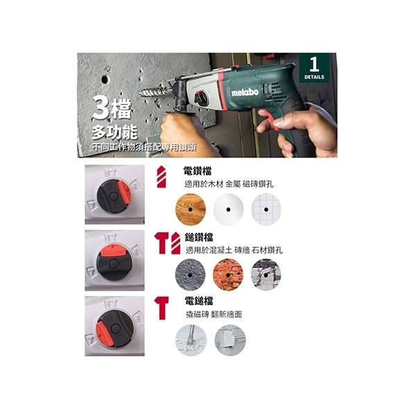 能力: 混凝土 26mm / 鐵 13mm / 木材 30mm