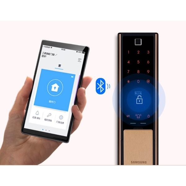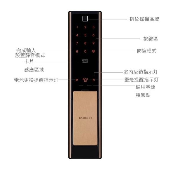 2020年最新款三星電子鎖,型號DP-739,搭載最新半導體指紋模塊,密碼,藍芽,卡片,鑰匙,臨時密碼,APP顯示進出紀錄,關門後選擇自動/手動上鎖的功能切換,自動喚醒,無須手動接觸按鍵區,內建中文語音小秘書,操作設定不用說明書也能輕鬆完成。