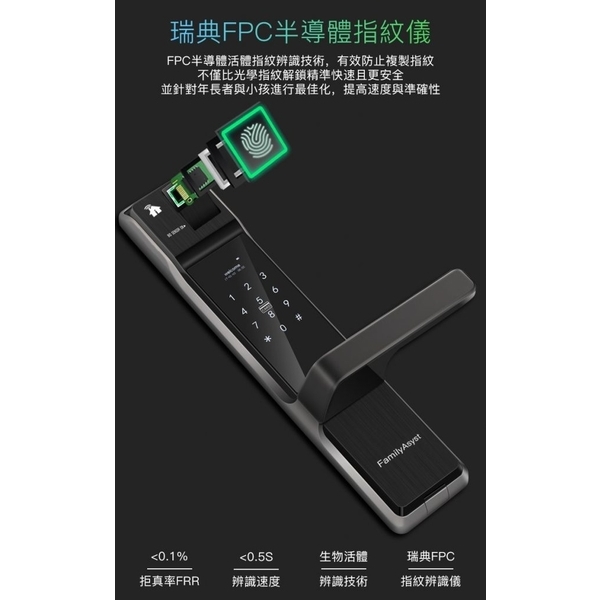 時效密碼:超低錯認與超高正確辨識率.指紋獨立模組.96小時抗腐蝕鹽霧測試.30萬次抗疲勞測試.100萬次抗磨損測試.