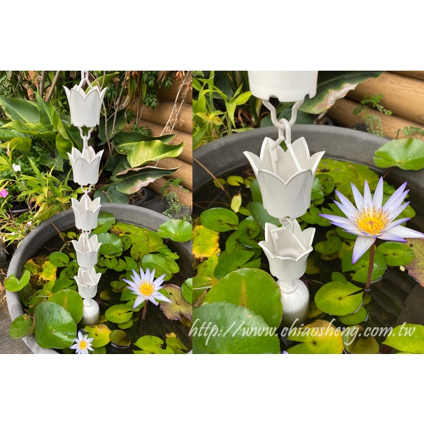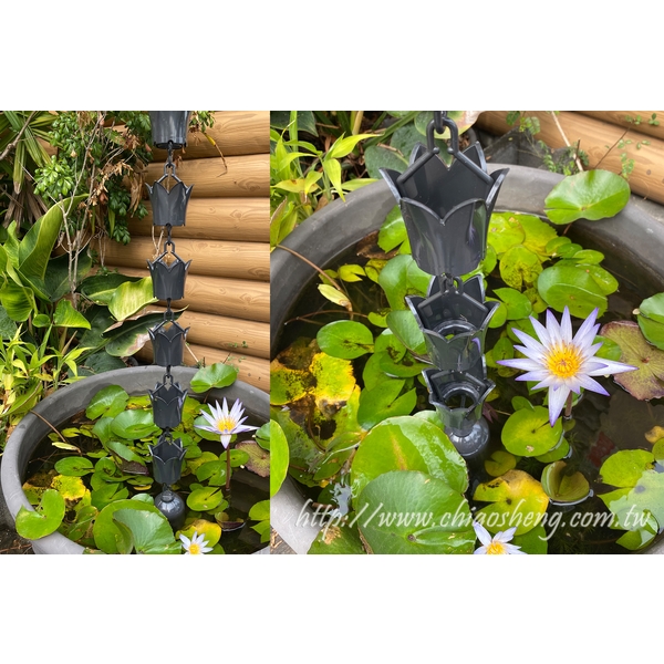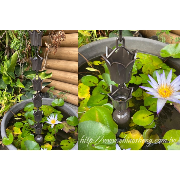 主要用途是建築物水漕排水,將水漕集中的雨水導入地面的功能。取代傳統落水直管,雨水透過水鏈傳遞,在雨天寧靜的庭院裡,觀賞雨水順水鏈而下的景色,十足和風韻味,讓人們的心情隨滴水鏈的美景悠然的沉澱。兼具排水與景觀,是建築物加分的良好選擇。