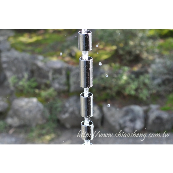 具節奏感的落水鏈,由三種不同尺寸圓筒組成,雨水藉由通過長短交錯的圓筒,打奏出優美的音樂饗宴,在視覺上流水串動如絲的美感,簡約的風格,時尚的品味。