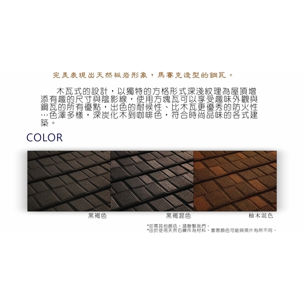 木瓦式的設計,以獨特的方格形式深淺紋理為屋頂增添有趣的尺寸與陰影線,使用方塊瓦可享受趣味外觀與鋼瓦的所有優點,出色的耐候性,比木瓦更優秀的防火性…色澤多樣,深炭木到咖啡色,符合時尚品味的各式建築。