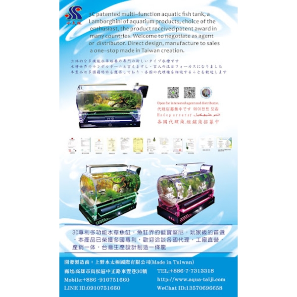 上野水太極國際有限公司立於西元1987年,公司創立初期主要是以開發獨特造型魚缸、特殊水族造景、FRP景觀 造景工程等相關系列產品,1995年涉入大型海洋館工程中超大型水族缸之製造,本公司為了將海洋館工程之技術微小化到能與室內裝修業結合的前提下,遂在西 元1999年研創出能同時具有水族與裝修效能的水舞汽泡牆,以及水舞傢俱,同年進一步將水舞汽泡牆與百貨公司之商品櫥窗做出結合,而成功的開發出 獨步全球商品櫥窗市場的水舞物品展示櫃,翌年,再將水舞汽泡牆與廣告業結合,推出水牆燈飾招牌。