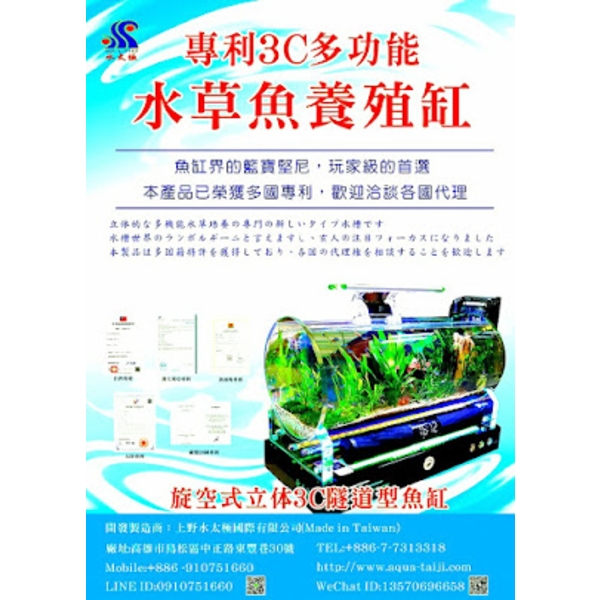 本公司經多年的努力與構思並融合傢俱業、建材業、燈飾業、百貨業、廣告工程業,以及水族工程等等製造技術,創造出一種前所未見的水太極專利水舞商品,本商 品以顛覆上述行業的姿態開始在市場出現,同時融合了建材、傢俱、燈飾、廣告用器具的功能,本商品所產生之光耀絢爛的水舞汽泡流,除了能提升整體裝潢設計的 氣氛外,更為靜態的建材傢俱帶來動態的生命力。對於商業空間來說,更可藉著水舞汽泡流的躍動,提高陳列商品的價值,吸引消費者的目光刺激消費者的購買慾。