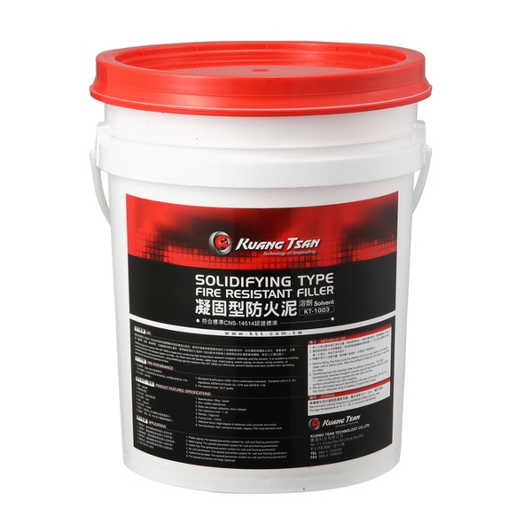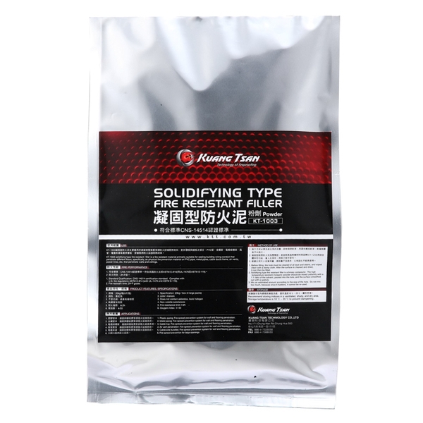 凝固型阻燃防火泥(KT-1003)是由耐高溫無機材料與溶劑混合而成,對於貫穿管件可充分發揮防火效果,凝固型防火泥受到火與熱等高溫作用時,會產生炭層阻止火的延燒及熱的傳遞,適用於建築物管線貫穿部,對於樓板與牆板之部分,電纜線架、金屬管、塑膠管、風管、匯流排、空調管路等開孔貫穿,使用凝固型防火泥(KT-1003)能有效阻絕火焰瞬間延燒及濃煙毒氣擴散,降低火災蔓延擴大。