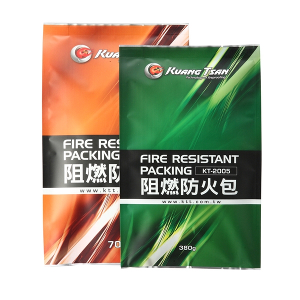 阻燃防火包(KT-2005)外部由編織緊密特殊處理的玻璃纖維布組成,內部是由防火耐熱材料製成,具有阻火及防煙效果施工方便,遇火時防火包內之防火耐熱材料能迅速膨脹,能有效封堵各種孔洞及縫隙之作用,然而主要適用於建築物管線貫穿部防火封填耐燃材料,對於樓板與牆板之部分,因電纜線架、金屬管、塑膠管、風管、配線導管、空調管路等開孔貫穿,使用阻燃防火包(KT-2005)能有效阻絕火焰瞬間延燒及濃煙毒氣擴散,達到有效將火勢控制在火災發生的局部範圍內,降低火災蔓延擴大,用防火包做填塞,可取代過去耐火磚、岩棉等材料,相比之下阻燃防火包更有顯著隔熱耐火效果。