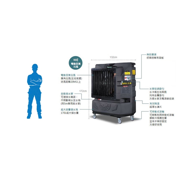 變頻水冷扇營業用大機種,適用於各種室內、外悶熱場所。工廠、汽車修配廠、溫室、畜牧業、餐廳、店面、活動場所等皆適用。