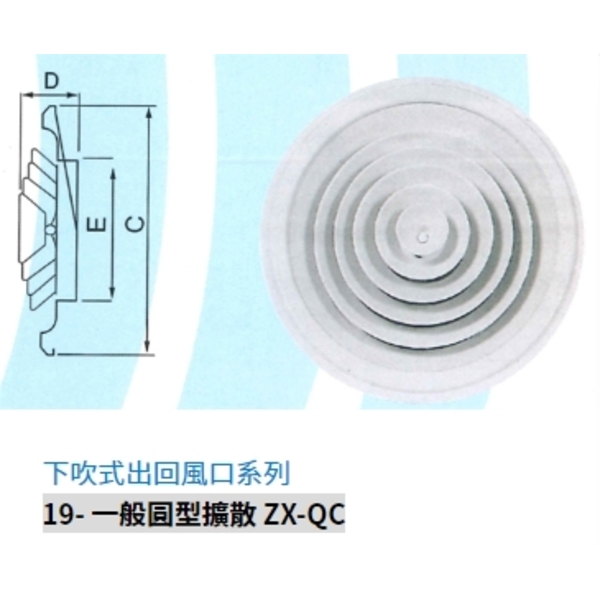 每層擴散圓框均為滾壓成型外框與內框為活動式可分開,邊有二個不同高度可調整二種風量之吹出角度