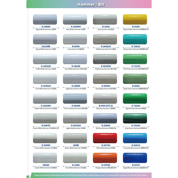 國麗實業為粉末塗料的專業製造廠,在台灣20多年來已深受業界肯定,產品皆符合美國玩具八大重金屬ASTM F963-17及歐盟RoHS相關限值含量規定,請安心使用。此色卡中產品皆為庫存色,基本包裝為25公斤,少數產品為20公斤,若標準色卡中無符合需求之顏色,亦可依您的色卡或國際色卡(Pantone、RAL、Japan Paint等)進行配色開發,歡迎聯絡我們對色及打樣。