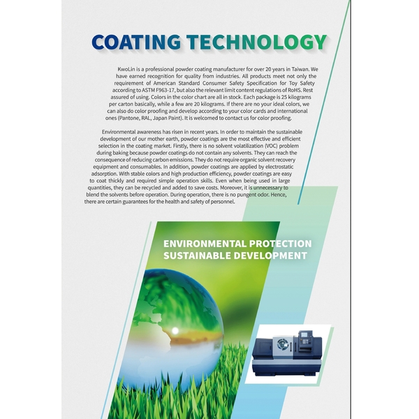 近年來,環保意識抬頭,為了維持地球的永續發展,粉末塗料為塗裝市場中最有效能和效率的選擇。由於粉末塗料不含溶劑,烘烤時無溶劑揮發排放(VOC)的問題,可達到減少碳排放量的效果,也不需有機溶劑回收設備及耗材支出。同時,粉末塗料利用靜電吸附上粉,容易厚塗,操作技巧簡單、顏色穩定且生產效率高,甚至於大量使用時可以回收添加利用,降低成本。此外,粉末塗料操作前不需預調溶劑,且操作中無刺鼻氣味,對於人員健康及安全性有一定的保障。