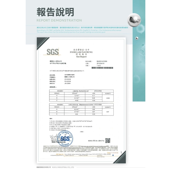 此抗菌效果可避免細菌於物體表面孳生繁殖,減少人體接觸細菌的機會,並且有耐候、耐高溫、耐洗滌等特性。此外,根據內頁所附的SGS報告,依JIS Z2801驗證說明,當抗菌活性值(R)大於2.0,表示有抗菌效果。報告數據顯示國麗ABP抗菌粉末塗料之抗菌性能及為優良。