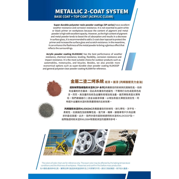 丙烯酸粉末塗料KL0363AC具備最優良的耐候性、耐化學性、流平性、柔韌性、抗腐蝕性及耐衝擊性能,是汽車、機車、腳踏車等戶外用品需求的最佳首選。此外,我們亦提供超耐候透明粉末塗料KL0435SP及一般聚酯透明粉末塗料KL0084等更經濟型的選擇供參考。
