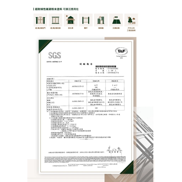 內頁所附上的SGS檢驗報告也證明 超耐候性氟碳粉末塗料具有極優異的物理、化學性質。此類粉體塗料可廣泛應用在鋁門、鋁窗、鐵門、鐵窗鑄造、門窗、採光罩、欄杆、帷幕牆、交通設備戶、外公共工程設施等。