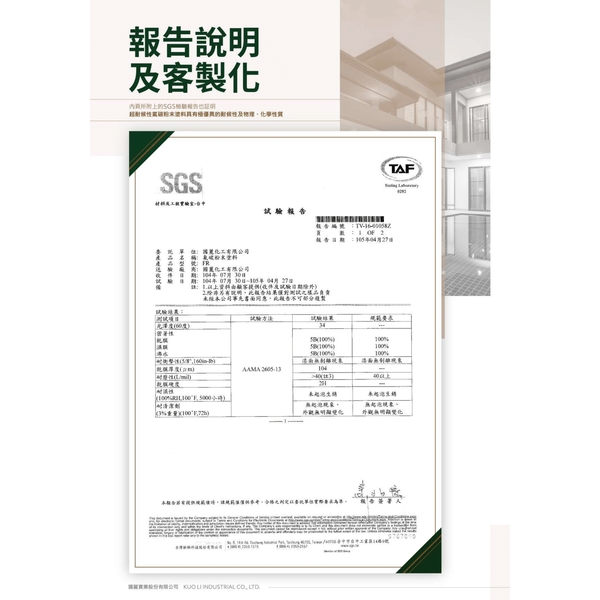 內頁所附上的SGS檢驗報告也證明 超耐候性氟碳粉末塗料具有極優異的物理、化學性質。此類粉體塗料可廣泛應用在鋁門、鋁窗、鐵門、鐵窗鑄造、門窗、採光罩、欄杆、帷幕牆、交通設備戶、外公共工程設施等。