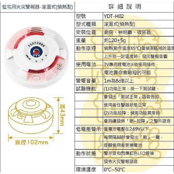 動作原理:偵熱(動作溫度65°C)當偵測區域的溫上升到一定溫度時,發出警報音響。