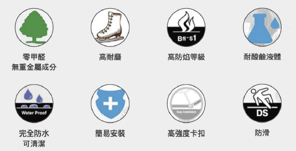 歐風的防水地板亦具備防火防焰的特性,能有效阻燃,防火等級達到B1 級,遇火自熄, 不產生任何有毒體。