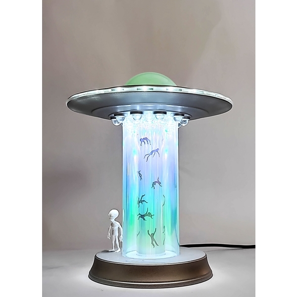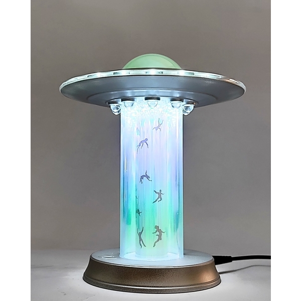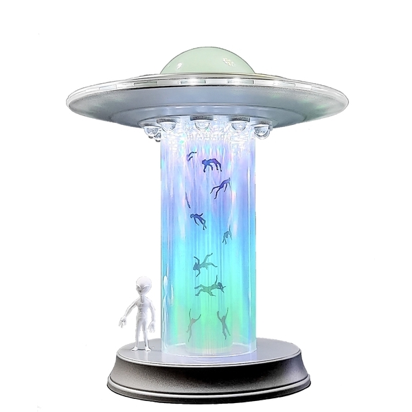 *此飛碟模型經多年的探索實驗終於找出了利用雷射全息反光膜結合特製的led燈使反射出立體光束像極了UFO的‘’牽引光束‘’,此模型開發,正可以讓您分享網路傳說中的外星高科技文明‘’牽引光束‘’*飛碟燈是仿製虛擬飛碟放光造型.所放射的立體彩光可隨視角上下的改變變換光彩.觸控開關可控制彩光的動態變換或靜態狀態.外星人有夜光功能.適合於居家擺設照明.有療癒.娛樂功能.