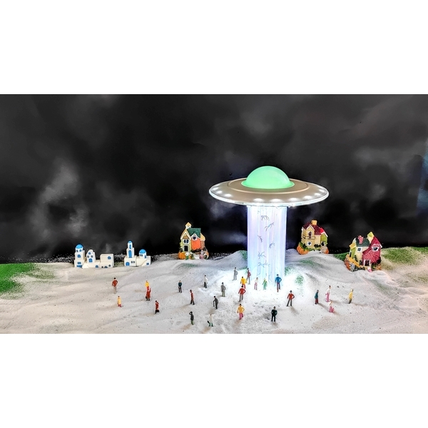 UFO飛碟燈利用雷射反射膜結合,特製LED燈,使能顯示3D立體光束,完美的表現UFO投下能量光,擷取及輸運人物的效果。