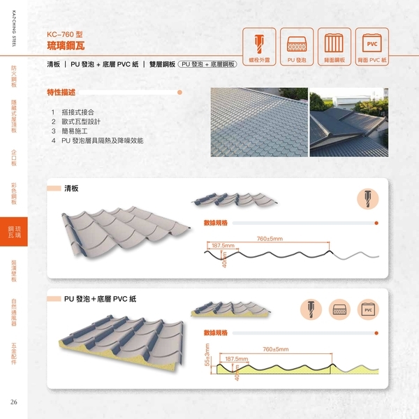 KC-760型產品文件 : 琉璃鋼瓦-清板|PU發泡 + 底層PVC紙|雙層鋼板(PU發泡 + 底層鋼板)1