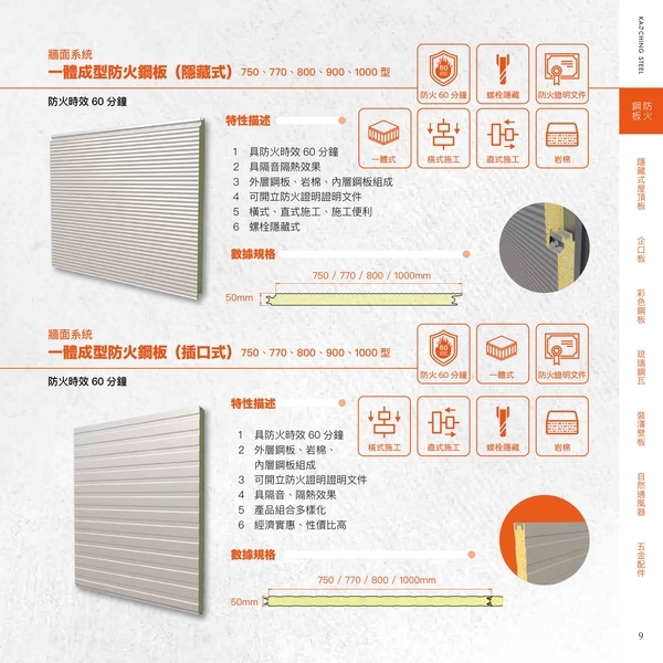 750、770、800、1000型產品文件 : 牆面系統一體成型防火鋼板(隱藏式)防火時效60分鐘