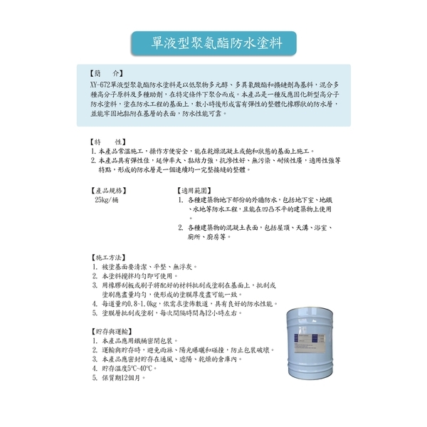 XY-672單液型聚氨酯防水塗料是以低聚物多元醇、多異氰酸酯和擴鏈劑為基料,混合多種高分子原料及多種助劑,在特定條件下聚合而成。本產品是一種反應固化新型高分子防水塗料,塗在防水工程的基面上,數小時後形成富有彈性的整體化橡膠狀的防水層,並能牢固地黏附在基層的表面,防水性能可靠。