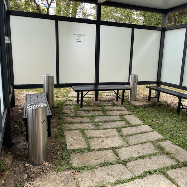 T5日光燈、吸排兩用風扇、落地煙灰缸、長椅、訂製綠半反強化玻璃or隱密性高霧面玻璃