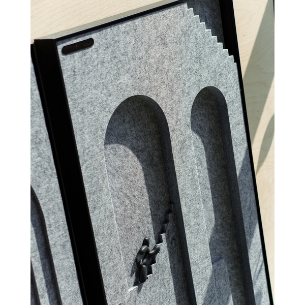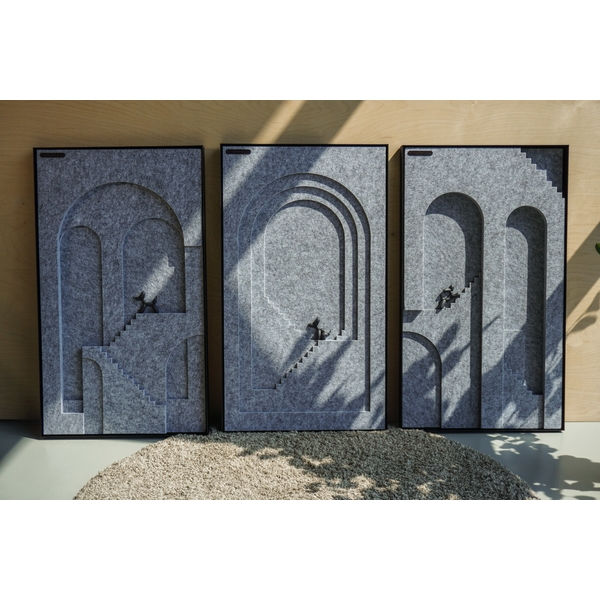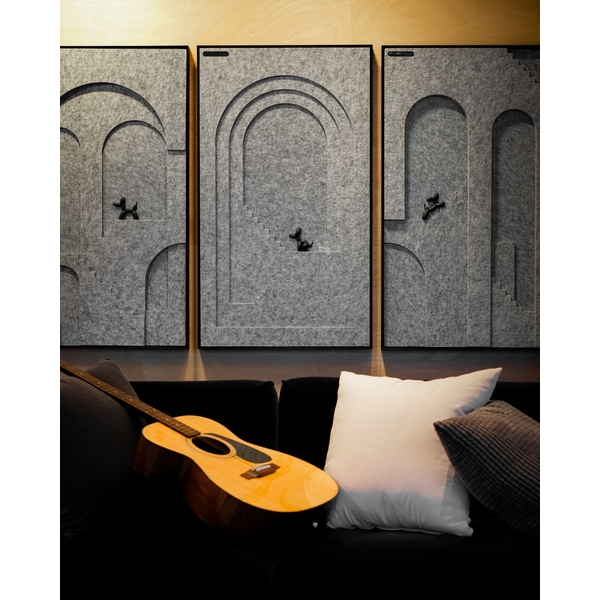 起初是為了解決室內設計客戶的需求,massform客製了一系列藝術化的吸音產品,像是吸音掛畫、壁燈和吊燈等,不僅具有卓越的吸音效果,還能與空間的設計完美融合,增添美學價值。2023年,將這概念進化延伸,開發出少量生產的聲學藝術壁畫,使客戶能夠更快速地選擇並使用到這些結合高度實用性與設計感的產品。